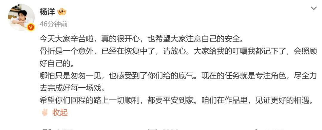 回溯到2月22日,杨洋也曾发文回应手部骨折:那次他说大家辛苦了,很高兴见到大家,也提醒大家注意安全。骨折属于意外,正在恢复中,请别太担心;粉丝的叮嘱他都记在心里,会好好照顾自己。即便只是短暂碰面,他也感受到了粉丝给的勇气和支持。现在他要把精力放在角色上,尽最大努力把每一场戏做好。