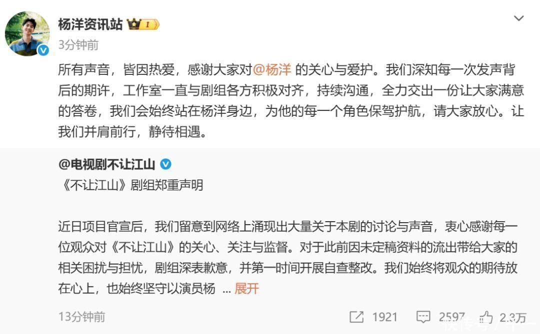 早些时候,《不让江山》开机后,有关“阴阳剧本”和配角私自加戏的传闻在网上发酵,引发不少讨论。剧方随后发布声明,为未定稿资料流出带来的困扰道歉,并已启动自查整改。声明强调会以杨洋饰演的男主李叱为核心,保护角色完整性,否认“阴阳剧本”和私下加戏,称所有演员使用一致的剧本;同时透露杨洋在进组前手部有受伤,已与团队沟通并调整了行程。接下来,杨洋工作室也把剧方的声明转了出来,并补充了一些话。工作室在转发里写道,所有声音源于热爱,感谢大家对杨洋的关心与支持。我们理解大家的期待,工作室一直在和剧组多方对接、保持沟通,力求交出让大家满意的作品,会一直陪在杨洋身边,为他的每个角色保驾护航,请放心,静待和大家相见。