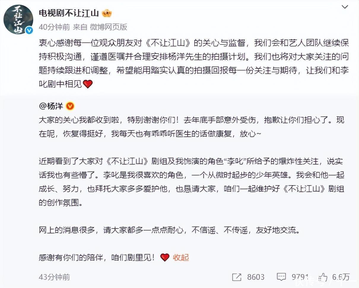 杨洋还提醒:网上信息多,大家耐心一点,别信谣别传谣,和平友好地沟通就好。当晚,《不让江山》官方微博转发了杨洋的博文,回应里感谢大家对剧集的关注与监督,表示会和艺人团队保持沟通,遵医嘱合理安排拍摄,并会持续跟进大家关心的问题,努力用踏实的拍摄回报期待,也盼着剧里见到李叱。