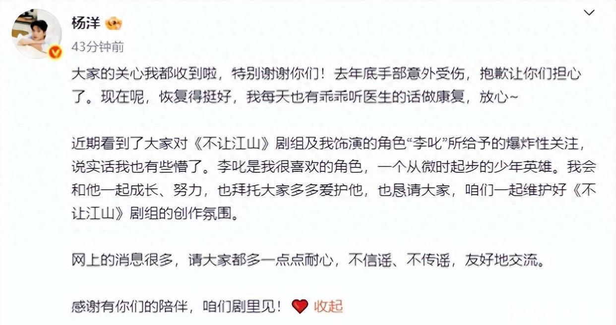 2月27日晚上,杨洋亲自发博回应手部受伤的事:大家的关心我都看到了,真的很感谢!去年底手部意外受了点伤,抱歉让大家担心了。他说“现在恢复得不错,每天按医生说的好好做康复,大家放心~”。他也提到最近大家对《不让江山》剧组和我演的李叱关注度爆表,说实话有点懵。李叱是我很中意的角色,从小起步的少年英雄,我会和他一起努力成长,也希望大家多多疼爱他,咱们一起保护好剧组的创作环境。